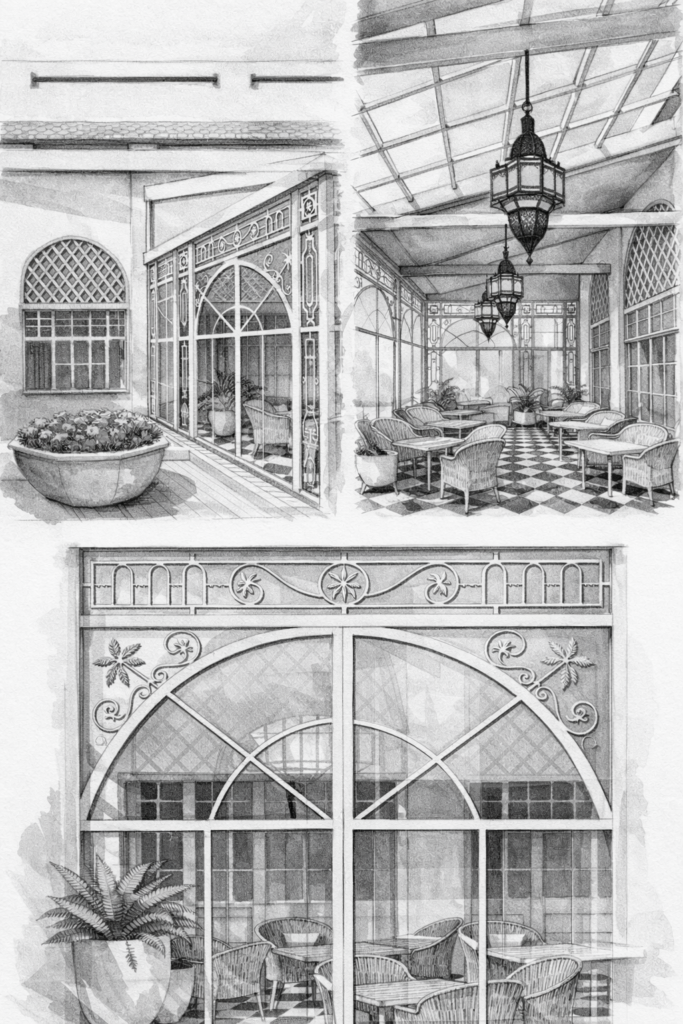 Parallèlement, Zin Archi intervient également sur la conception d’une élégante verrière de type jardin d’hiver, nommée “L’Orangerie”, destinée à prolonger et agrandir le restaurant existant. Cet espace lumineux permettra de profiter du jardin tout au long de l’année, dans une atmosphère raffinée mêlant végétation, lumière naturelle et architecture.