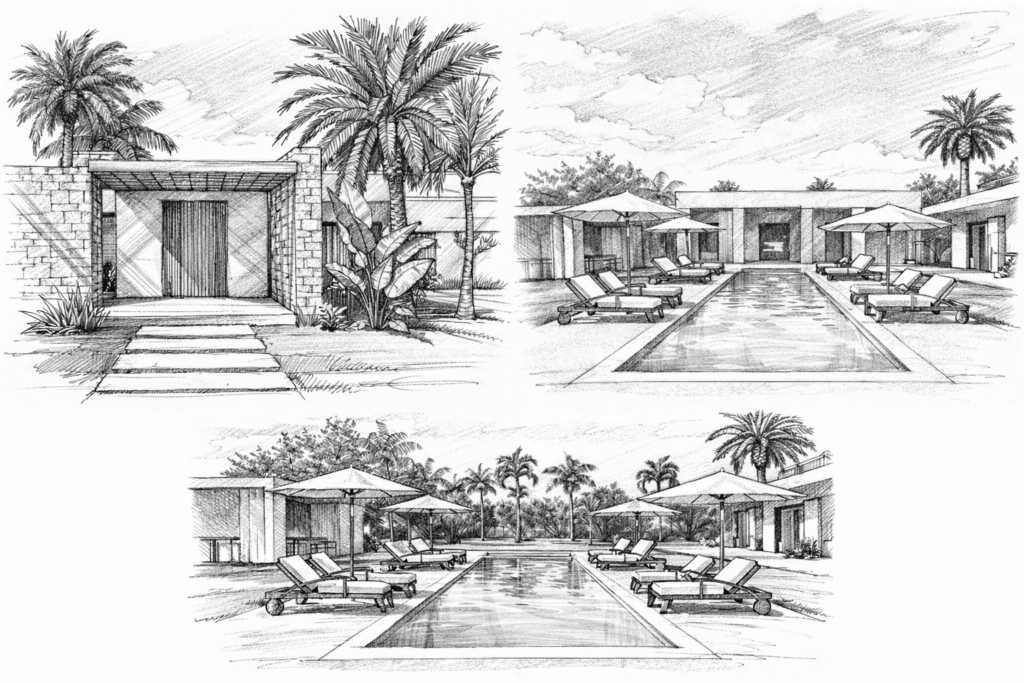 Les façades mettent à l’honneur la palette terre de Marrakech, à travers l’utilisation de claustras en briques de terre « bejmat » et d’un enduit texturé effet pisé léger « tadelakt herché », créant des jeux d’ombre et de matière en résonance avec l’environnement naturel.